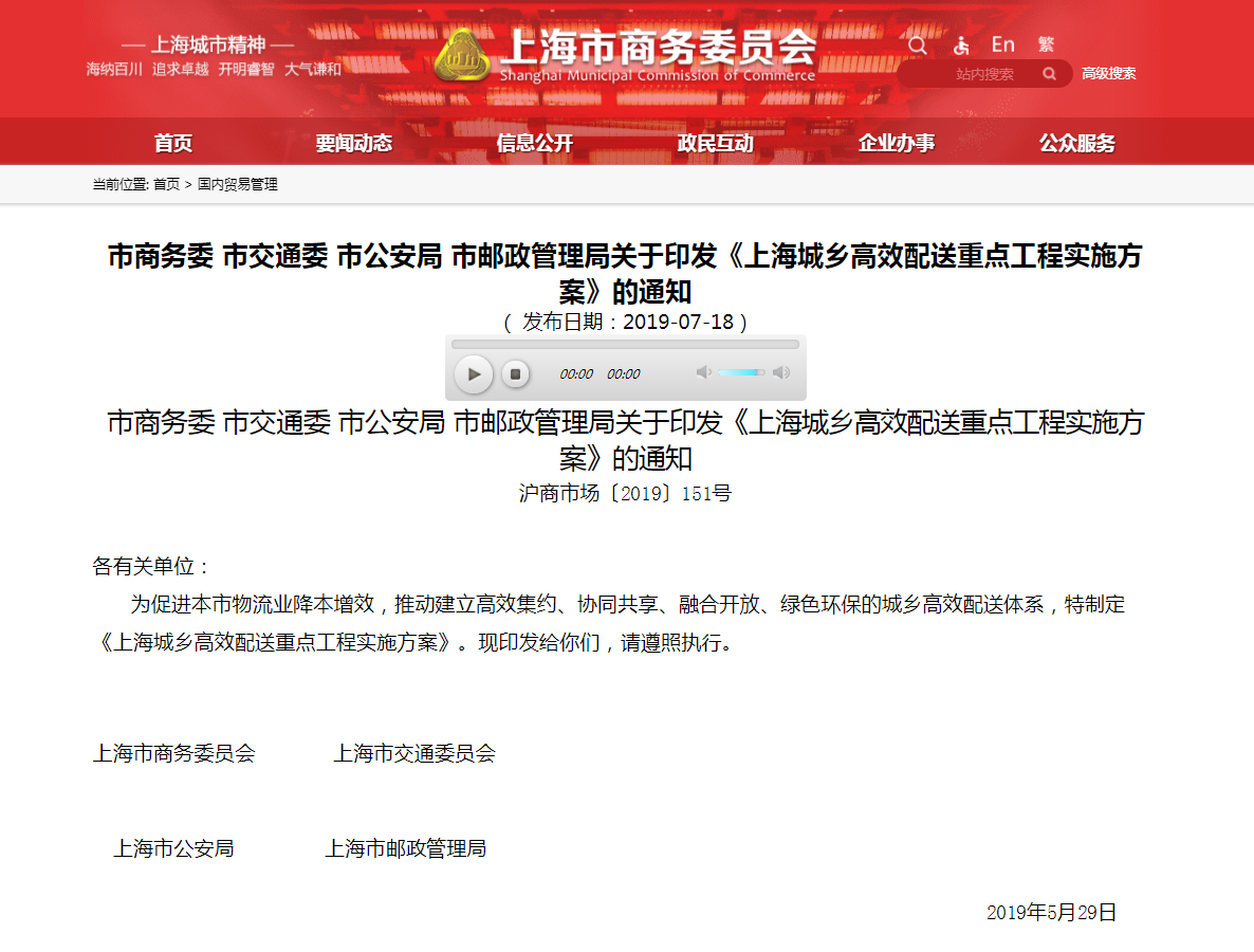 城市配送物流是上海物流业发展的重点领域之一。近年来,随着上海城市发展、人口规模扩大和人民生活水平提高,城市配送物流需求呈现规模扩张趋势。2018年,本市实现商品销售总额突破12万亿元;社会消费品零售总额达到1.2万亿元;全市电子商务交易总额2.89万亿元,其中网络购物交易额(含商品和服务)突破1万亿元,居全国城市前列。构建支撑连锁商业、电子商务等商贸业发展的城乡高效配送体系,成为发展现代流通、保障城市市场运行和安全的关键环节。
